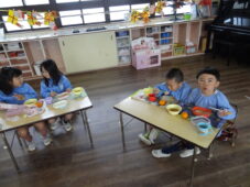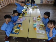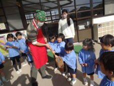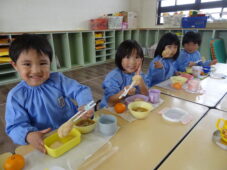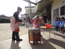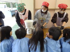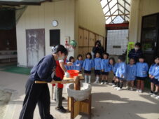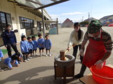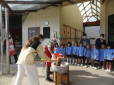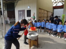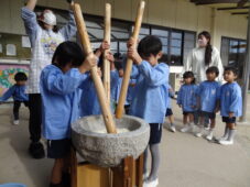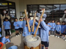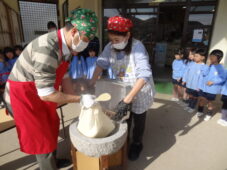 よいしょ、よいしょの掛け声をかけながら、おもちつきを見学しました。もち米がツヤツヤのおもちになるのを初めて見る子どもたちもいて、みんな興味津々です。担任の先生たちもみんなの応援を受けて、重い杵を持って頑張ってつきました。年長さんたちは千本杵で実際につきましたよ。