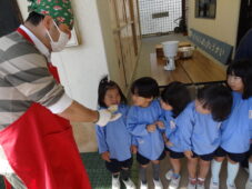 年末恒例のもちつき集会を行いました。もち米は、姉妹園である桔梗が丘幼稚園の元園長先生の田んぼで育てたもち米です。つきたてのおもちを食べられるので、子どもたちはとても楽しみにしていました。